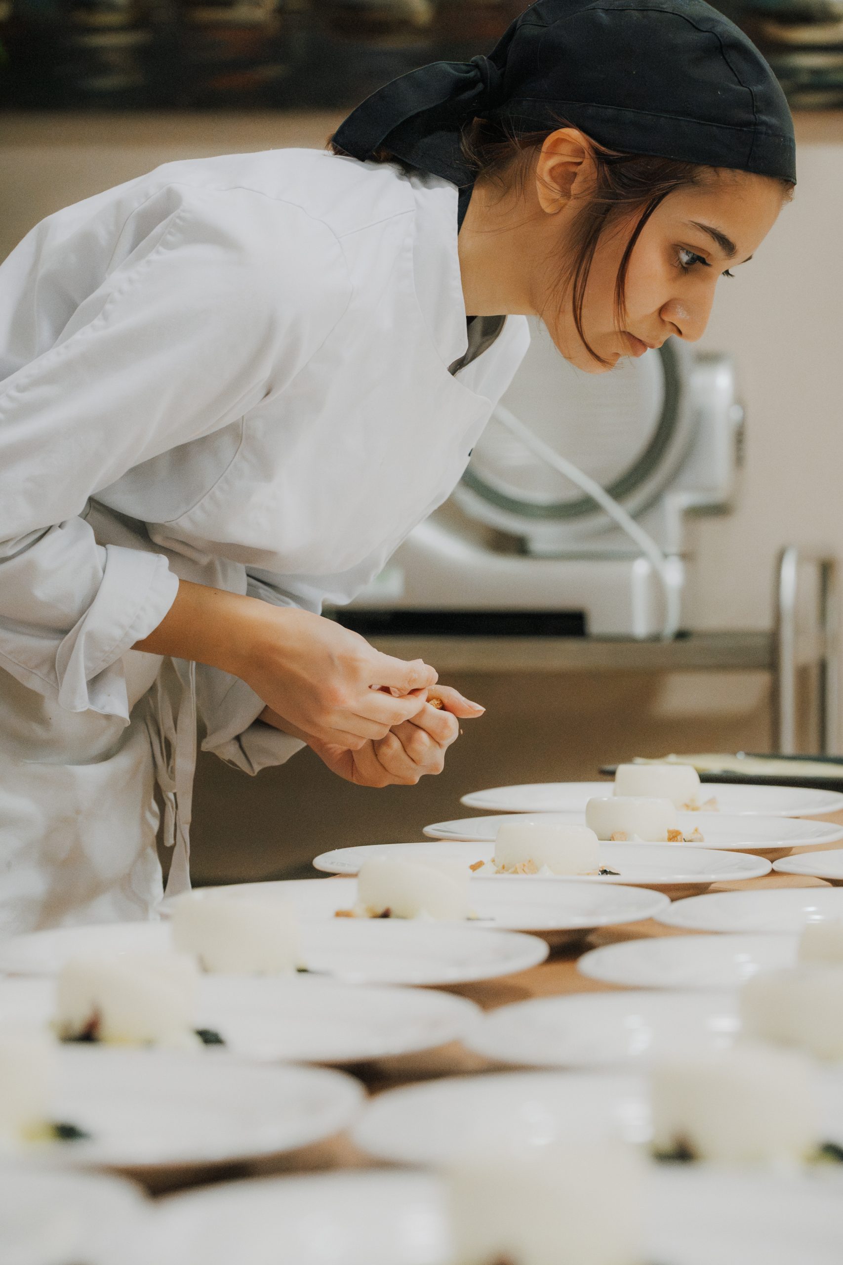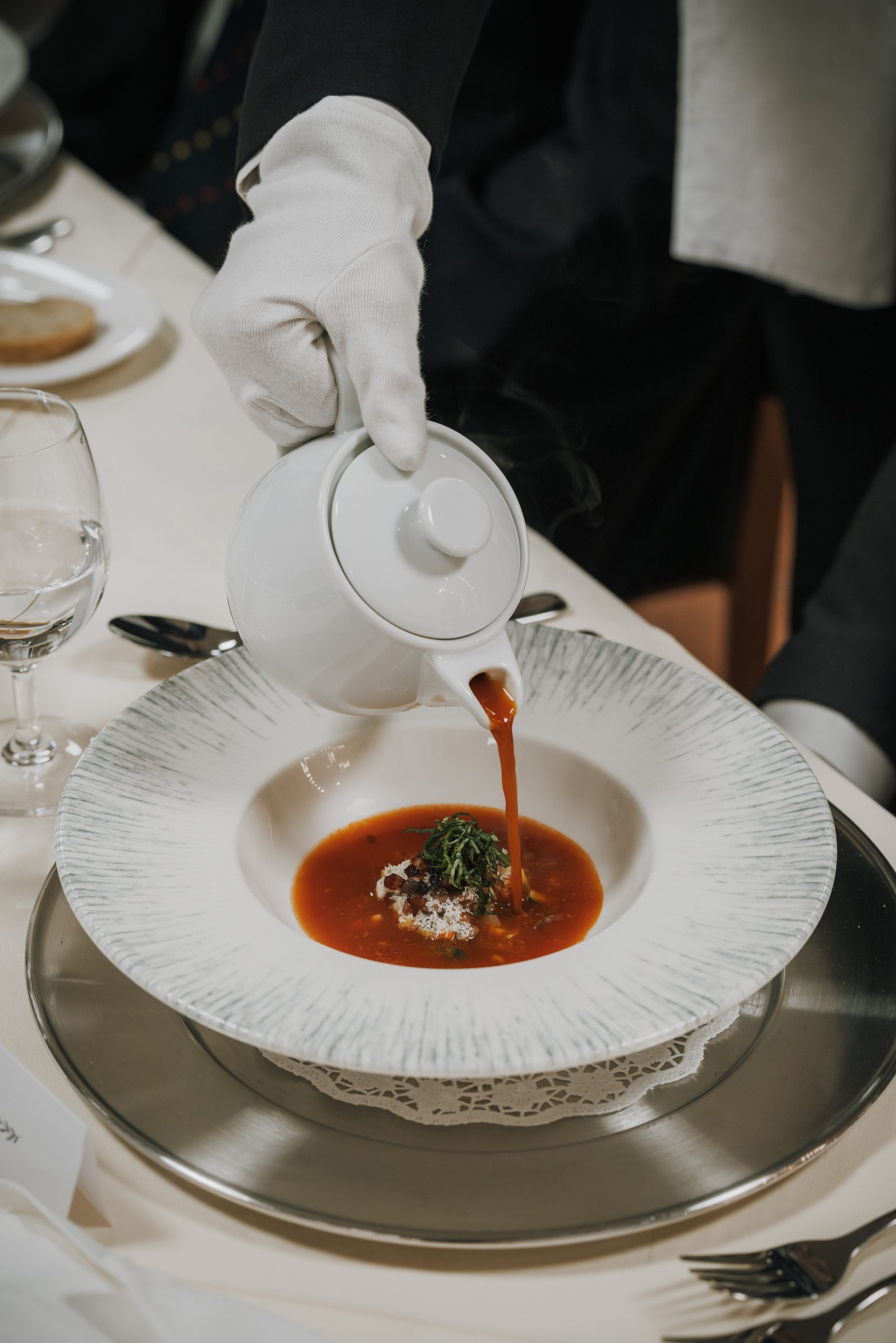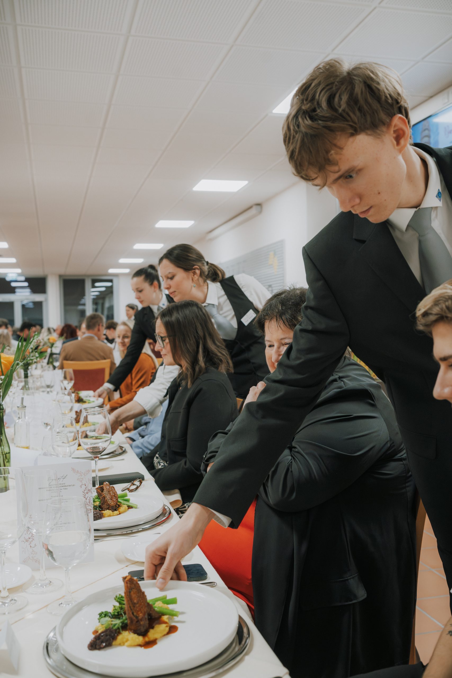 Schon der Empfang stimmte die Gäste auf den Abend ein mit hauseigenen Cocktails, Schaumweinen und Crunchy Bruschetta mit Zitronenöl-Frischkäsefüllung. Unter der fachkundigen Leitung von Küchenmeisterin Eva Hilbinger und Ernst Schaupp kreierten die Schüler*innen ein Menü, das nicht nur optisch ein Highlight war, sondern auch geschmacklich höchsten Ansprüchen genügte. Die kulinarische Reise begann mit einer Burrata im Garnelenkleid auf Feigen-Sellerietartar, gefolgt von einer feinen Minestrone mit Grießpasta und Schnittlauchöl.